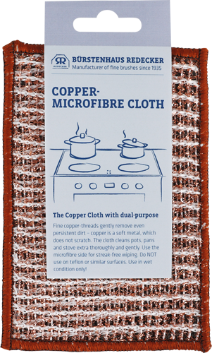 Fine copper-threads gently remove even persistent dirt – copper is a soft metal, which does not scratch. The cloth cleans pots, pans and stove extra thoroughly and gently. Use the microfibre side for streak-free wiping.