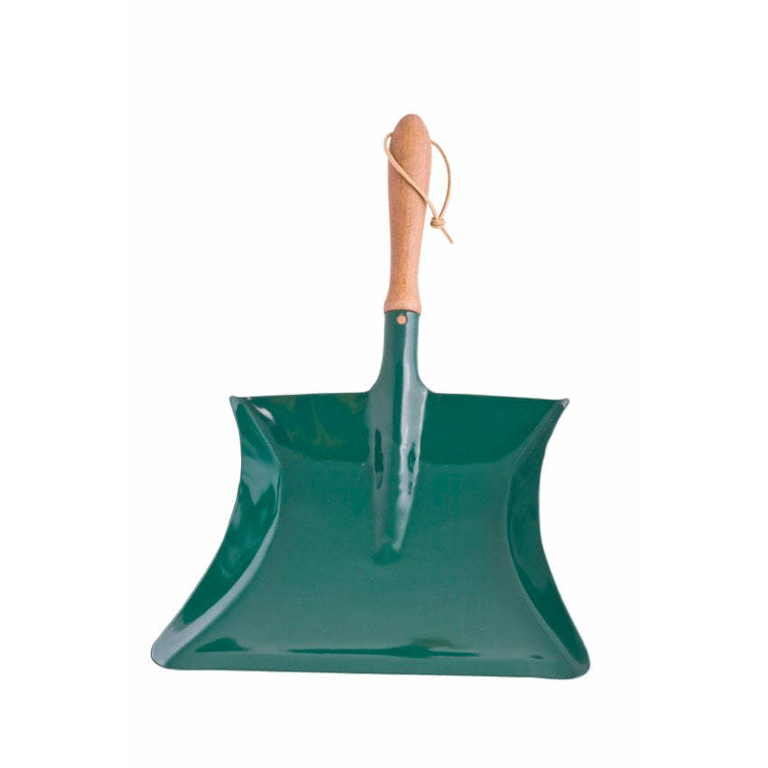A wide, durable, varnished metal dustpan in dark green, perfect for outdoor tasks whether sweeping out the garage or carrying kindling to the woodbasket. With a stained beechwood handle and leather loop for hanging out of the way when not in use, it works brilliantly with our outdoor hand brush, 183035. 42cm long x 27cm wide.