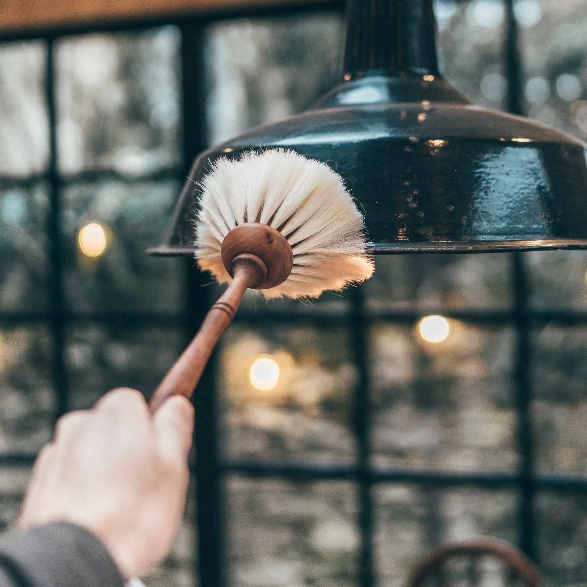 A long handle, round head, hand brush for dusting, entirely hand crafted using traditional skills. With an oiled, turned pearwood handle set with soft, light goat hair with a dot of black goat hair, this round headed brush makes light work of dusting thanks to the anti static properties of goat hair and their ability to collect rather than just spread dust particles. The long handle makes reaching easy whilst it is not too long as to be cumbersome for low level dusting of ornaments and shelves. 34cm long and finished with a leather hanging loop, it is an invaluable brush for general household dusting.