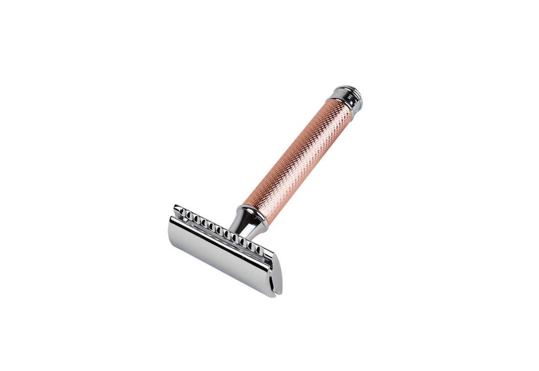 Rose gold R89 safety razor with closed comb, safety blade included.