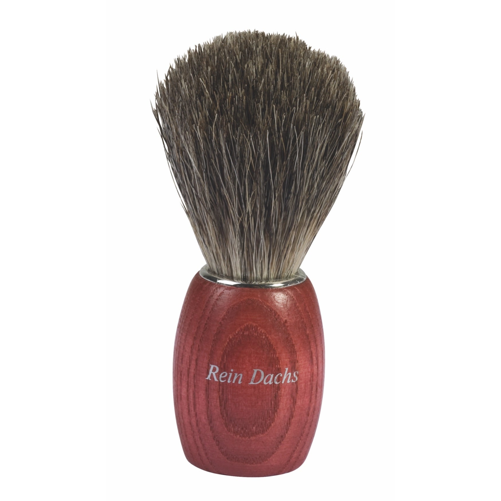 With a barrel shaped cylindrical handle finished with a polished metal ring around the top, our red, stained beechwood shaving brush bears the name of its brush head type across the front - 'Reine Dachs' (Genuine Badger) denoting natural, badger hair for a softer pre-shave lathering. Measuring 9.5cm high, it is also available with natural bristle, 641080.