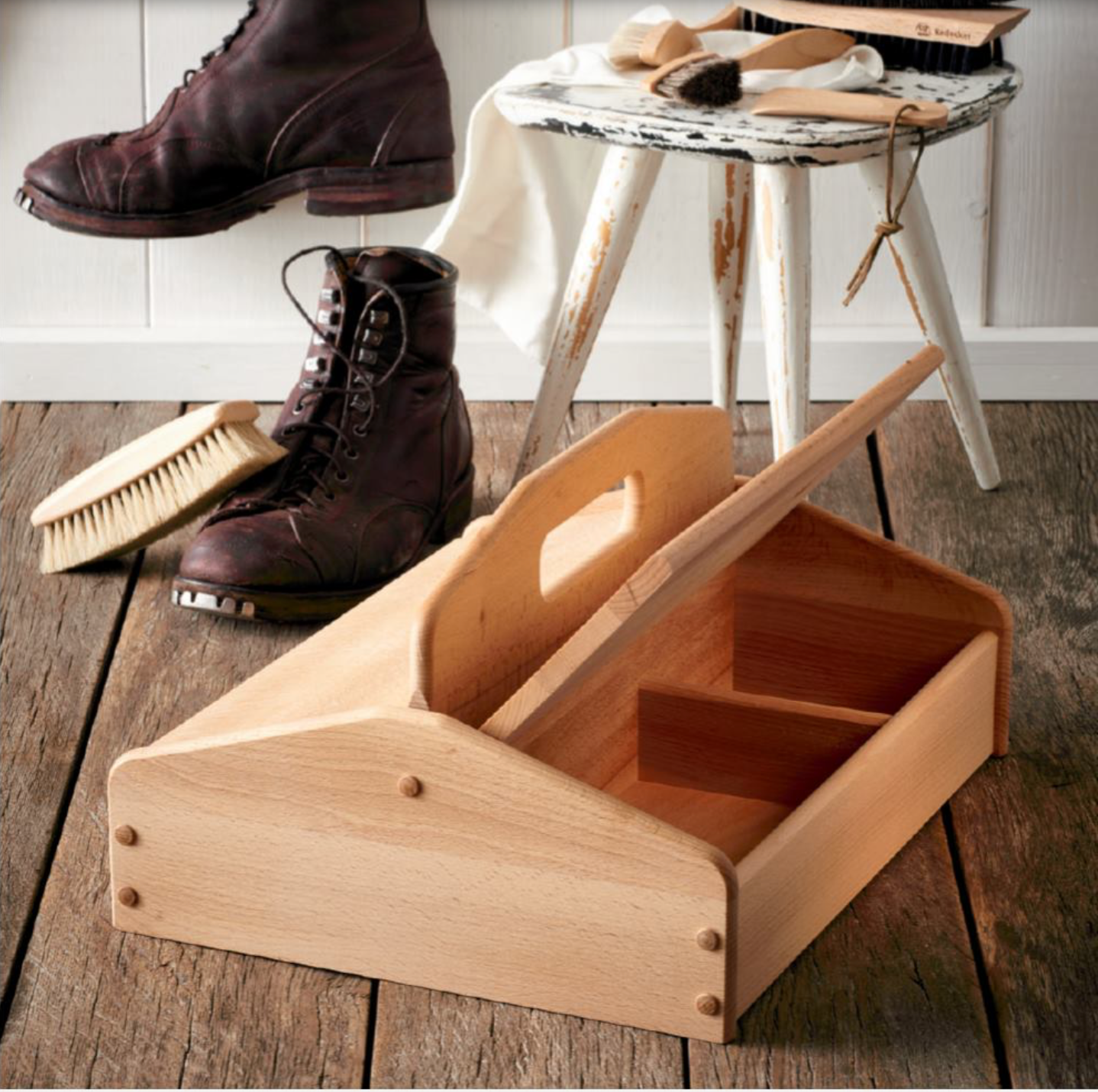 Store your shoe brushes and polish collection in this beautifully crafted, oiled beechwood shoe cleaning box with lids. Divided into two sections with a central carry handle, the sloping lids allow for larger brushes to be stored within and keep them tidily stored away ready for next use. 41cm long x 32cm wide x 20cm high, it is supplied empty for your own shoe cleaning equipment.