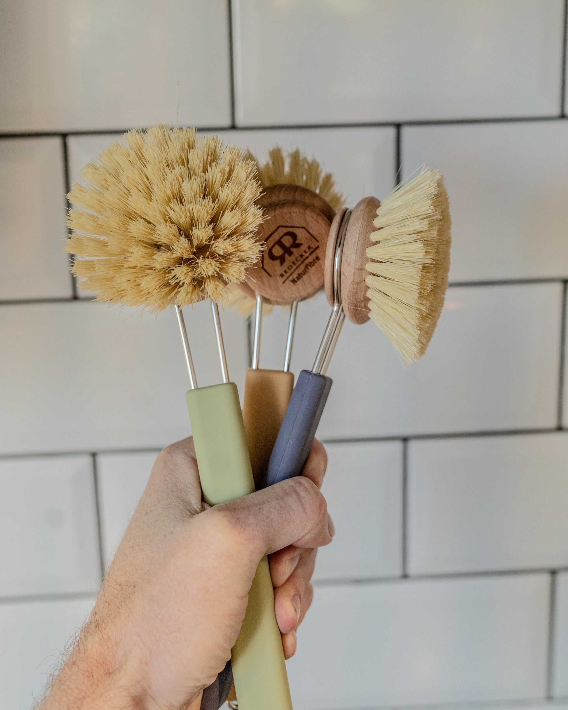 To insert or change the brush head, simply pull down on the silicone part of the handle. Both our small (4 cm) and large (5 cm) dish brush replacement heads are suitable for these handles.