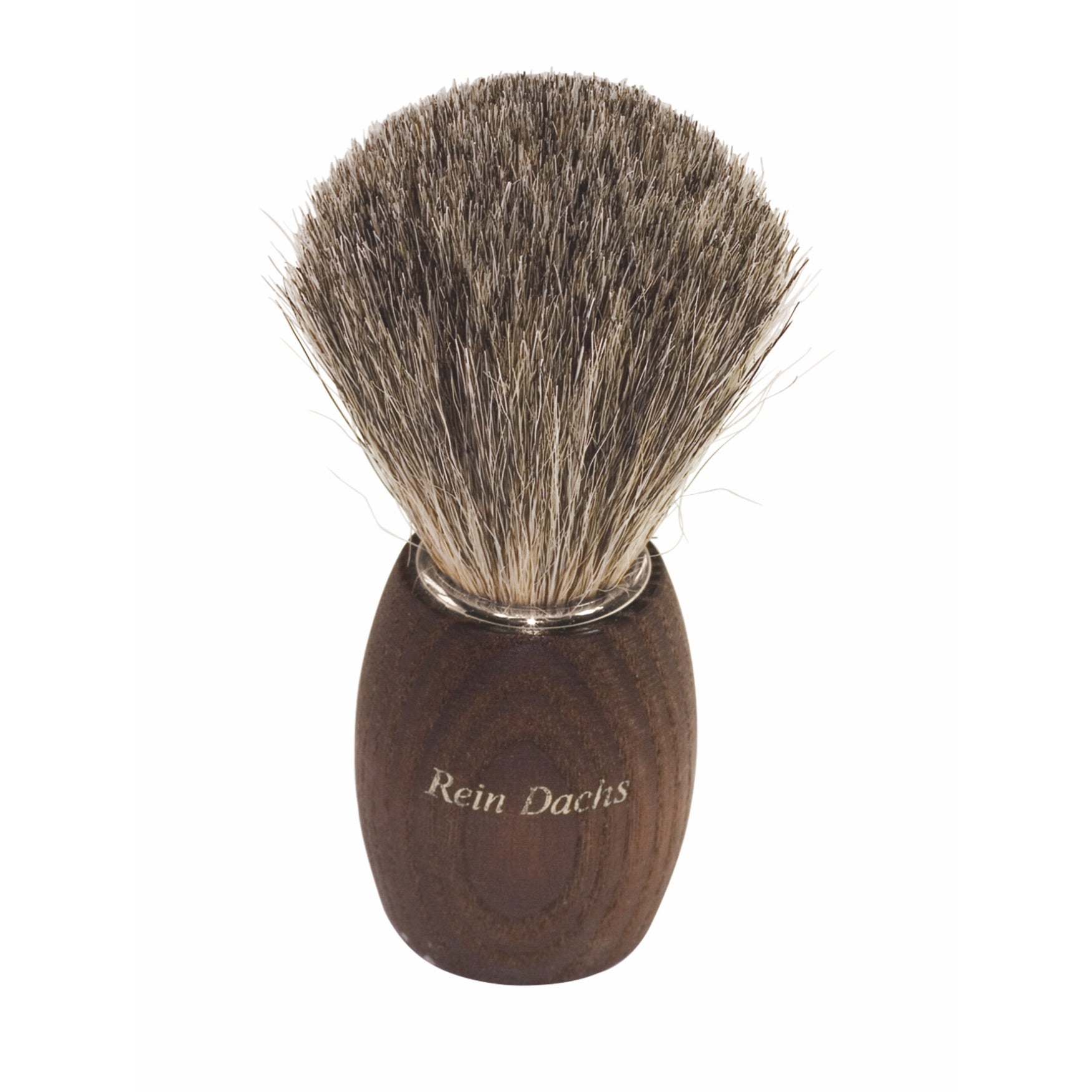 Hand crafted from oiled thermowood giving it a rich, dark brown finish and set with badger hair finished with a polished, metal ring around the top, our barrel shape shaving brush bears its brush head type in elegant silver lettering, 'Reine Dachs" (Genuine Badger) to the front. Measuring 9.5cm high, it is also available with a firmer texture light boar bristle brush head, 641073.