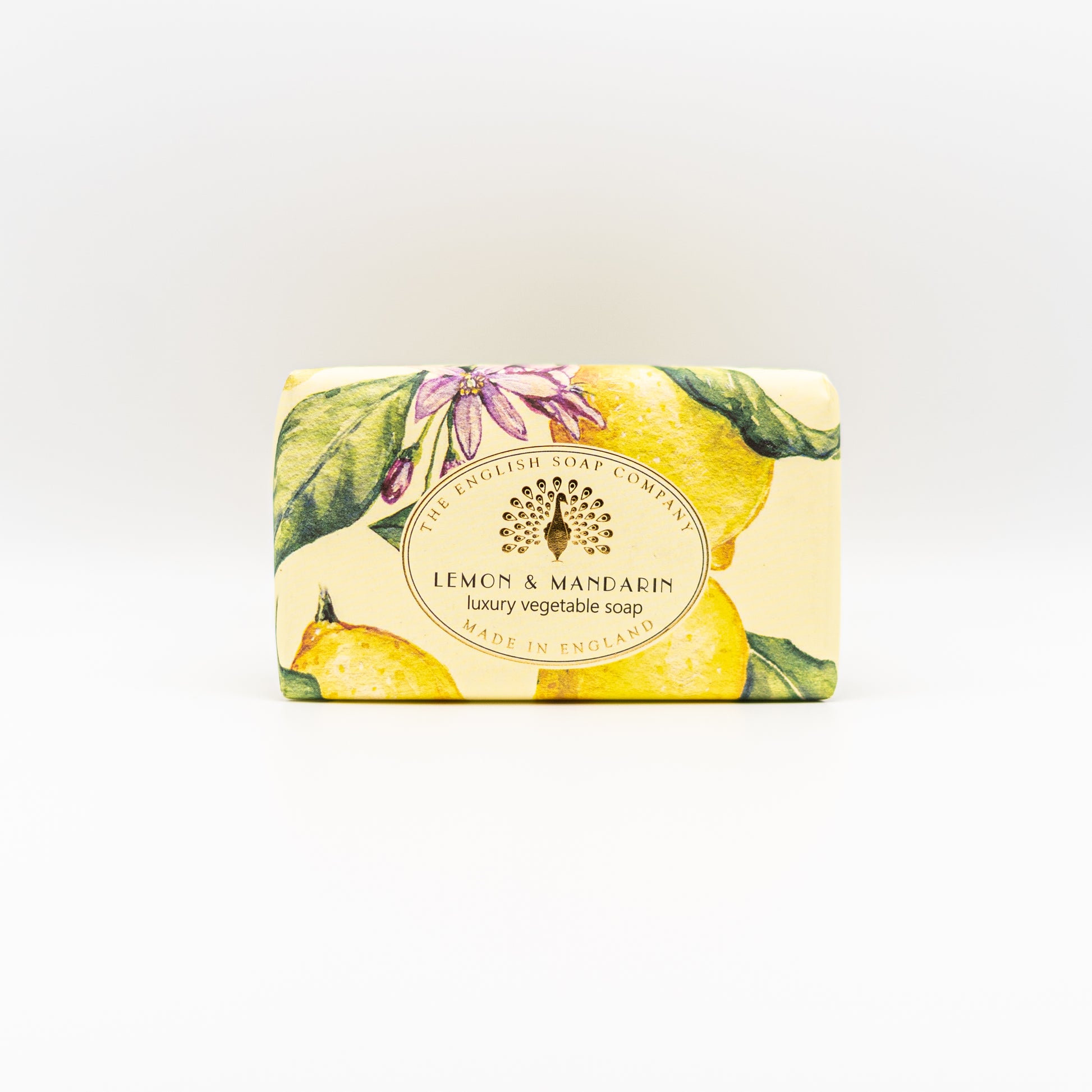 Indulge in the everyday use of a vegan friendly, luxury soap bar. Made using pure vegetable oils and enriched with shea butter to keep your skin feeling nourished. This Vintage Lemon and Mandarin Soap is part of our Vintage Collection. A collection of soaps designed to capture traditional styles, wrapped in fully recyclable paper, and decorated with vintage-inspired artworks. A sumptuous treat for yourself or a token gift for a loved one.