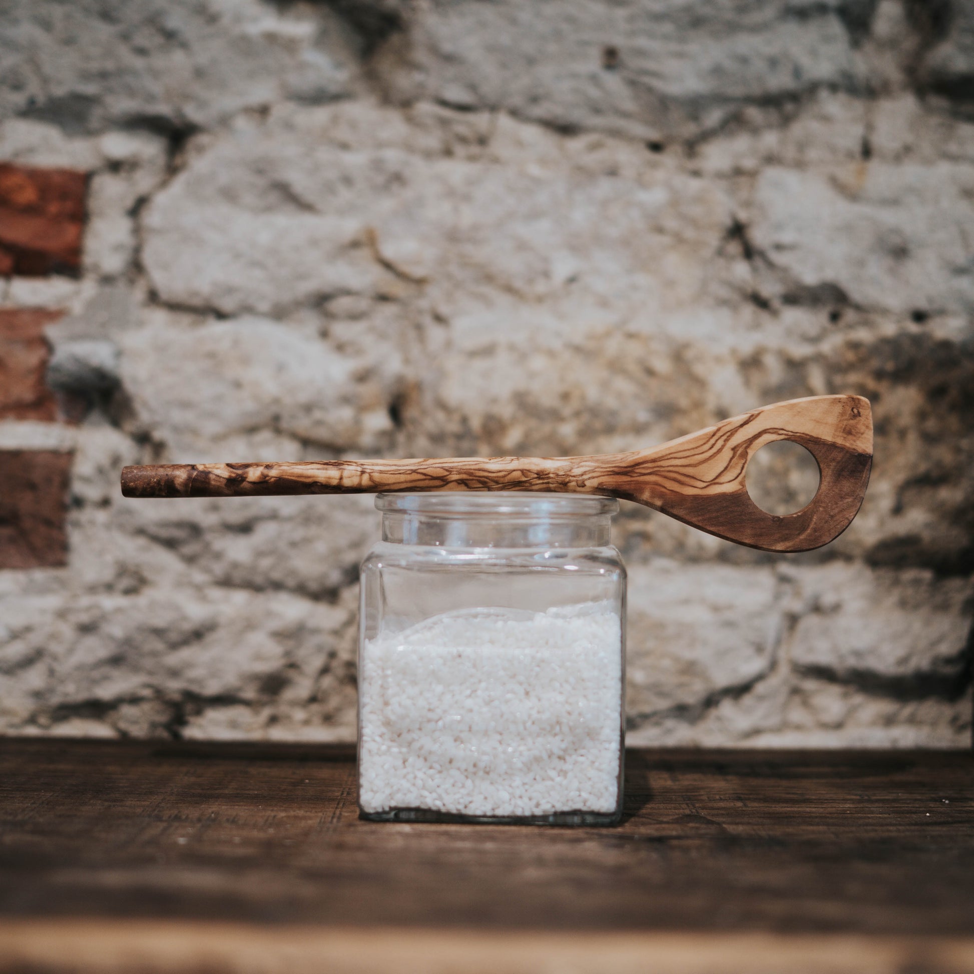 A long, 30cm, hand crafted, oiled olive wood cooking spoon with a hole in the centre of the shaped spoon end for allowing maximum contents movement within the pan when stirring. Ideal for use on all pans, including non-stick and Teflon coated as it will not scratch the surface. Also available as a solid, round spoon without hole, 741030.