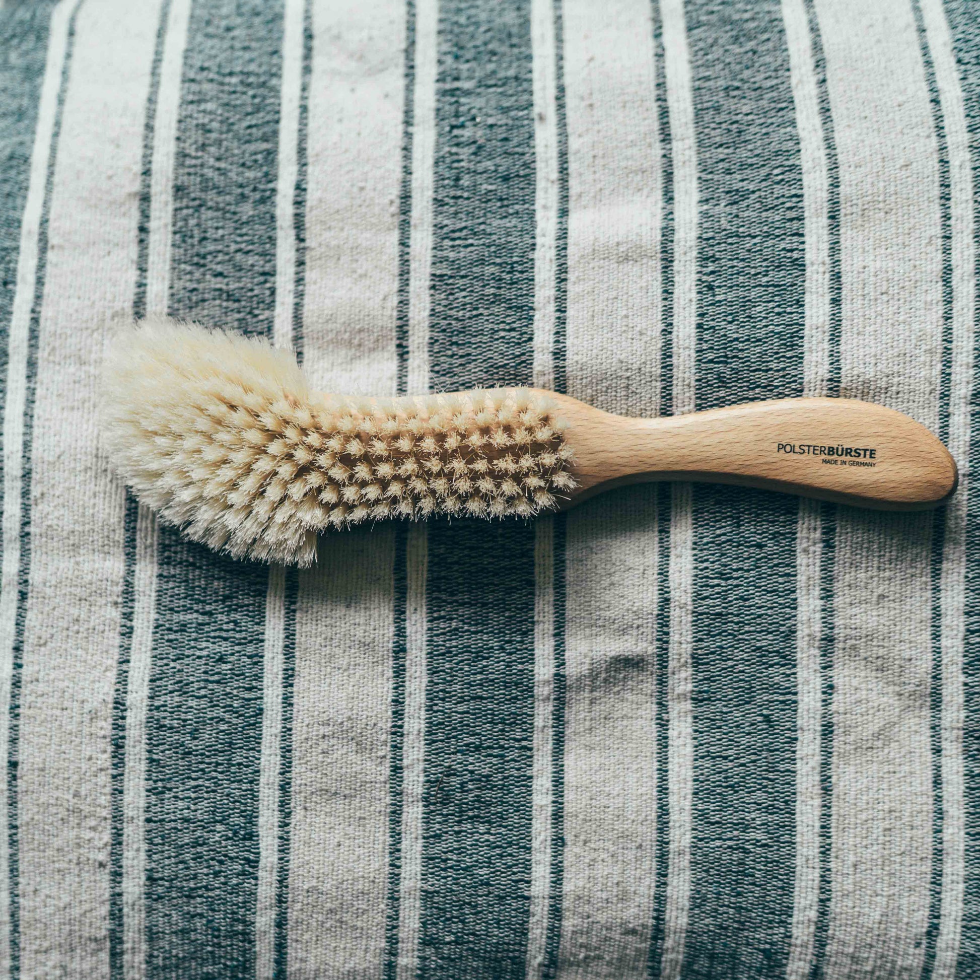 Sweeps across chair cushions and sofa cushions and upholstery in the home and on cushions outside on furniture in the garden thanks to its long, contoured handle and long brush head. Crafted from waxed beechwood and set with light, firm bristle in a slightly curved shape with splayed bristles extending in width at the end, it will remove fluff and dust with ease, keeping your cushions clean and ready to bolster or comfort the next occupier. 30cm long.
