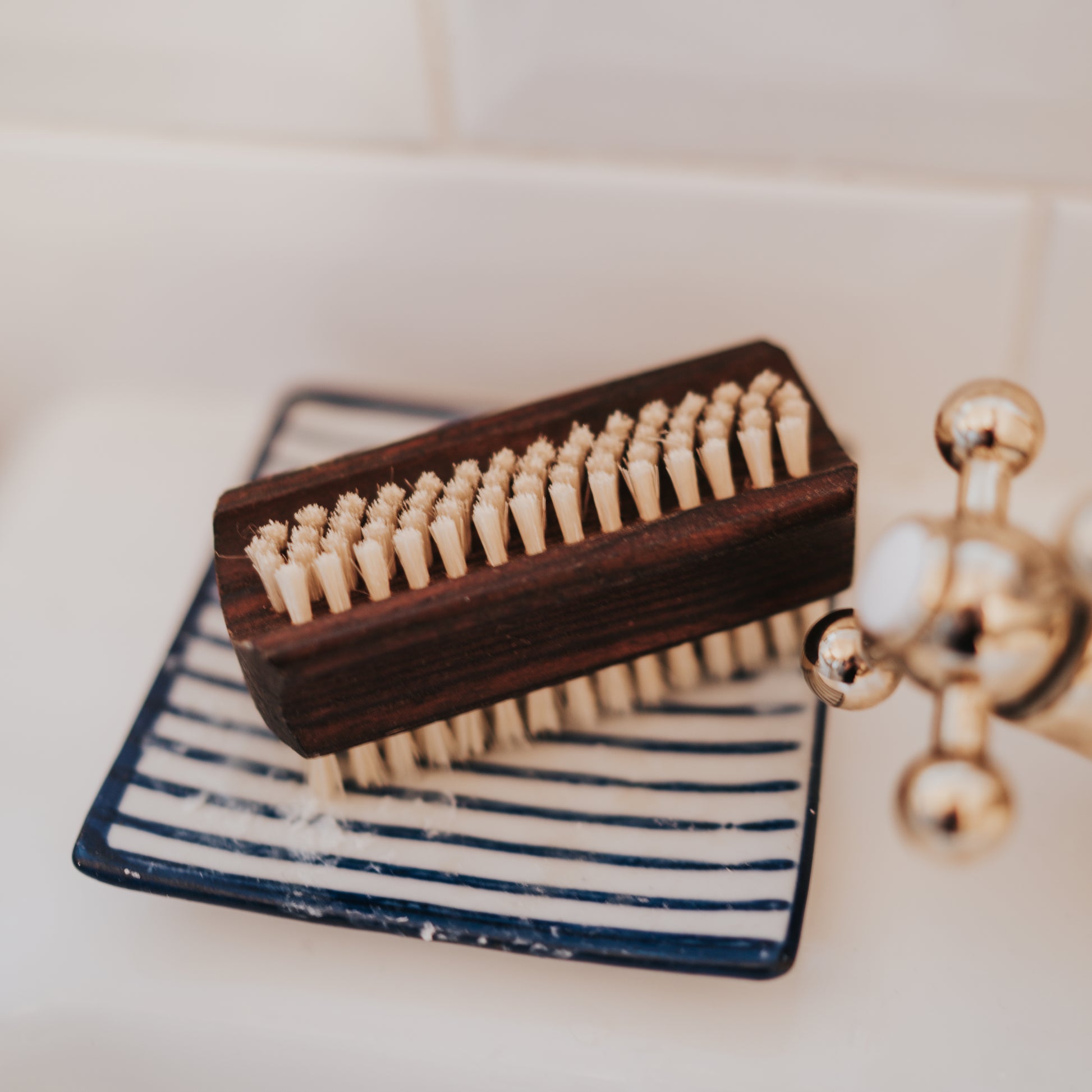 Our nailbrushes come in a variety of natural wood and fibre options. Choose tampico fibre, stiff nylon or extra stiff light bristle for the firmest brush head, and oiled, waxed or thermowood for water repelling qualities. Always rinse and air dry wooden nailbrushes after use.